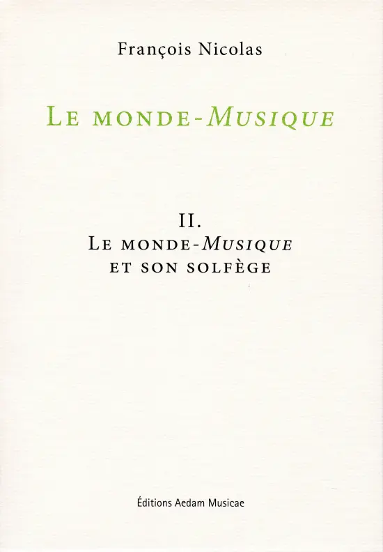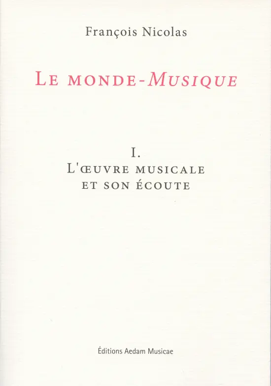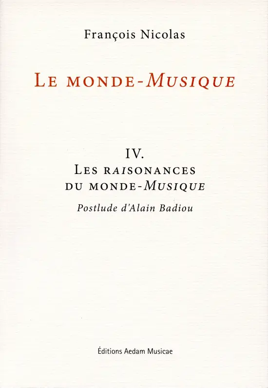 Répondre, avec la rigueur requise, à ces questions nécessitera quatre tomes : successivement une théorie de l’écoute musicale à l’œuvre (I), une théorie de la logique d’écriture légitimant qu’on parle ici d’un « monde » musical (II), une théorie de cette discursivité langagière propre au musicien qu’on nommera intellectualité musicale (III), une théorie de ces rapports du monde-Musique avec son environnement qu’on nommera raisonances (IV).